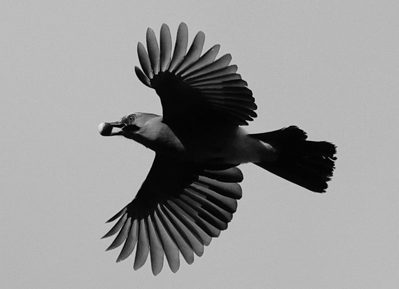 食いだめ、ではありません。食料を蓄えておくのです。写真はカケスが栗の実をせっせと運んでいるところです。