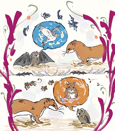 その昔、あるコウモリがイタチに捕まってしまいました。「俺は獣が大好物だ。食べてやる」とイタチが言うと「いや私は鳥ですよ、翼があって空が飛べますから」と言い、逃げることができました。
