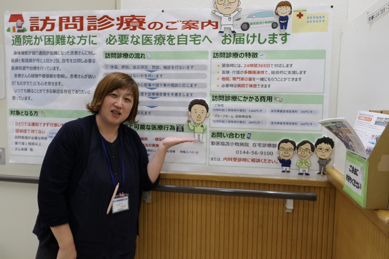 似顔絵は相談会の資料や在宅案内のポスターにも使われ、往診患者へ贈ったアクリルスタンドは涙を浮かべて喜ばれた。