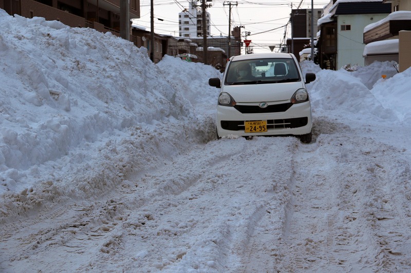 住宅街は積雪により車1台通るのがやっとの状況。路面は4WD車ですらスタックするほどザクザクに荒れており、転倒や事故の危険と隣り合わせの生活が続いています。