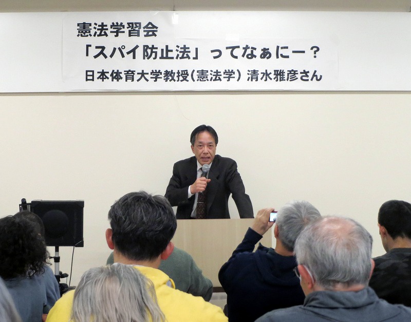 清水さんは、現在検討されている「スパイ防止法」の本質について、①「秘密」の範囲が極めて曖昧で、罰則が非常に重い。②警察と自衛隊の連携が強化され、軍事と治安維持の境界がなくなる。③民間企業や大学、メディアで働く人の身辺を調査する、民間人が監視の対象にされるなどの危険性を指摘。また、推進派の背後には、特定の宗教団体や政党の強い働きかけがあることも言及しました。