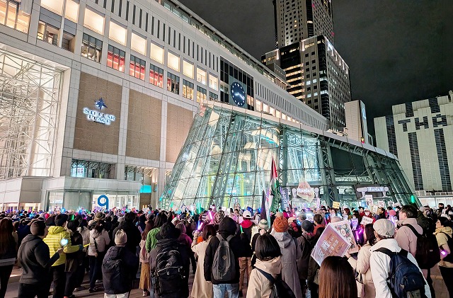 夜7時半から行われた札幌駅南口の行動には市民1400人が集い、ペンライトを手に「平和憲法はうちらが守る!」「戦争やめよ!」とシュプレヒコール。